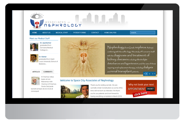 Project Description Services Provided Website Design & Development Consulting & Planning Content Management System Project Details Client: Space City Nephrology Date: August 1, 2009 Categories: Website Project URL: Visit online → Prev ProjectNext Project